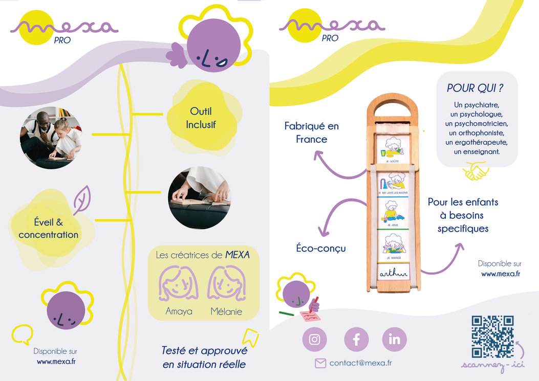 Au sein du cadre scolaire j’ai pu collaborer au près de l’entreprise MEXA (entreprise de création de jeux en bois inclusifs). Avec pour objectif de leur présenter plusieurs supports de communication qu’ils soient print ou digitaux.